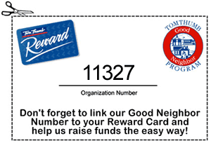 The next time you're at Tom Thumb, pick up a Reward Card application at the courtesy booth to fill out and link your card to NBCR's account. Tom Thumb will pay us a percentage of our account total, so be sure to use your card every time you shop. Print out a copy of the card, clip it out, and take it with you to the store as your reminder of our organization's Good Neighbor Program account number to fill in on your Reward Card application. Or if you already have a Reward Card, download and print a GNP Addition/Deletion form and return it to your neighborhood Tom Thumb Courtesy Booth.